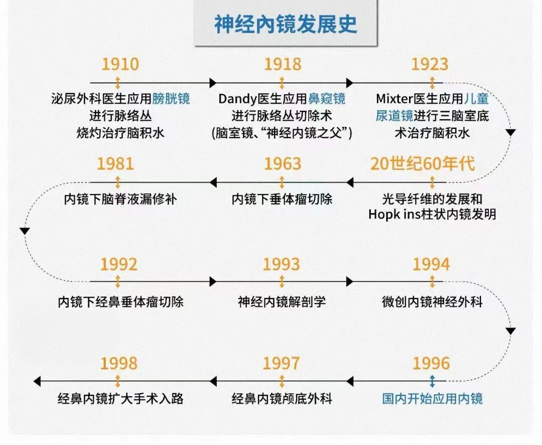 随后,医生们陆续报道了用神经内镜辅助治疗脑积水、垂体瘤等脑室和颅底疾病。但当时内镜的管径粗大,成像效果与手术照明较差,又缺少匹配相应的手术器械,并没有引起广泛的关注。