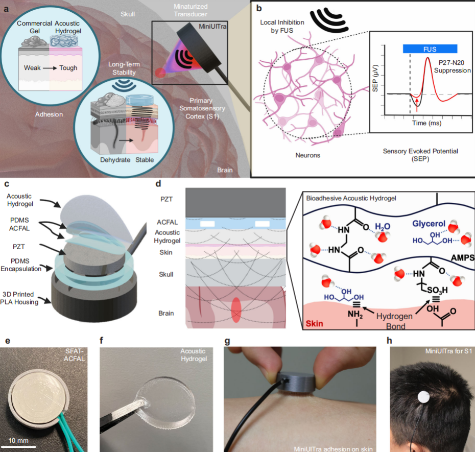 2、来自德克萨斯大学奥斯汀分校的科研团队,成功研发了一款微型化、可穿戴的超声神经调控设备—MiniUITra,该系统巧妙地将自聚焦超声换能器与一种创新的长效生物粘附水凝胶相结合,实现了如创可贴般便捷的长期佩戴和精准的皮层刺激。这项发表于《Nature Communications》的研究,为无创神经调控技术走向长期、家庭化应用铺平了道路 。